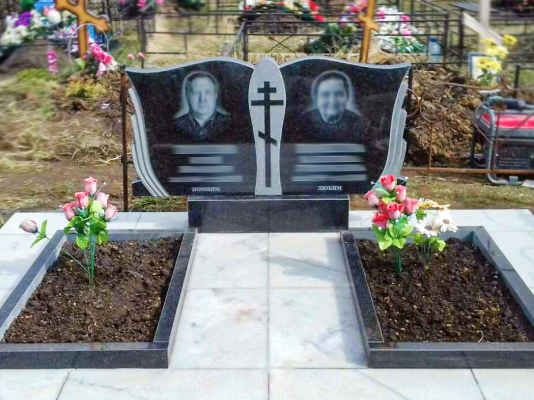 1. Комплект памятника из высококачественного гранита Габбро (стела 100×50×6 см, тумба 60×15×12 см, цветник 100×60 см).
