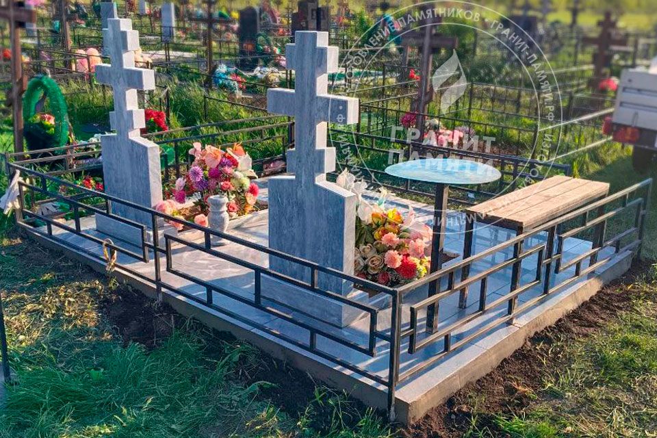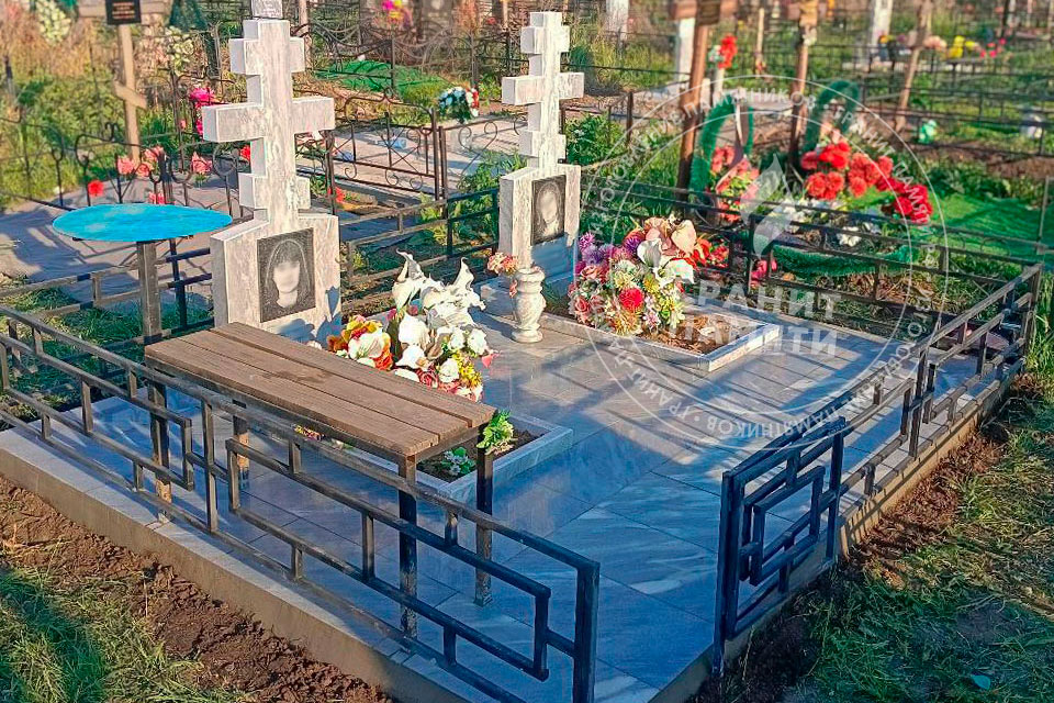Работы охватывают монтаж гранитных или мраморных стел, тумб, плит, цветников, заливку фундамента, а также дополнительные элементы по вашему выбору — ограду, цоколь, плитку, лавки, вазы.